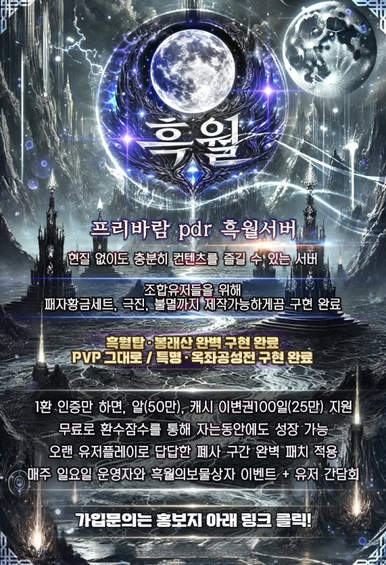 ✅PDR 흑월서버✅완벽한 유저와 소통과 유저친화적 서버✅확실한 뉴비지원이벤트✅단체이주보상OK✅ ✅ 흑월서버 1월 07일 GRAND OPEN ✅ 유저와 소통하는 투명 운영 / 유저친화 최우선 ✅ 잦은 섭팅 NO · 잦은 리붓 NO (안정 지향) ✅ 7.34 PDR · 반하자 지향 · 깔끔한 인터페이스 / 최고 구현율 지향 ✅ 단체이주보상 OK ✅ 흑월서버 핵심 컨텐츠 ✅ 흑룡레이드 / 다이쇼군 일일 레이드 완벽 구현 (보상 넉넉) ✅ 흑월탑 · 봉래산 완벽 구현 완료 ✅ PVP 그대로 / 특명 · 옥좌공성전 구현 완료 ✅ 공성전 · 남북대전: 한방 싸움이 아닌 전략 & 팀워크형 전투 ✅ 조합유저들을 위해 패자황금세트, 극진, 불멸까지 제작가능하게끔 구현 완료 ✅ 밸런스 & 성장 ✅ 5가지 직업 밸런스 안정화 (각 직업 특색 살림) ✅ 오랜 유저플레이로 답답한 폐사 구간 완벽 패치 적용 ✅ 초반 진입장벽 확 낮춘 뉴비 개선 패치 완료 ✅ 궁사 직업 추가 (완벽한 밸런스 지향) ✅시스템 & 편의 ✅ 불멸마법 보유중 ✅ 수천벌 캐시옷 + 천연염색 무제한 가능 ✅ 불멸 용무기 제작 + 무기 각인 시스템 구현 완료 ✅ 현질 없이도 충분히 컨텐츠를 즐길 수 있는 서버 ✅ 부캐 멀티 혜택으로 인게임 재화 대폭 상향 + 차별화된 혜택 ✅이벤트 ✅ 1환인증만하면, 알(50만), 캐시이변권100일(25만) 지원 무료로 환수잠수를 통해 자는동안에도 성장 가능 100일동안 캐시이변권을 통해 캐릭터 마음대로 꾸미기 가능 두루마리만 다깨도 쇄자+1세트, 각성일본무기류 구매가능 장비대여권 2주 지급으로 초반성장 빠르게 가능 ✅ 상시 이벤트 진행: 경마 / 폭탄피하기 / 킹덤그라운드 외 다수 ✅ 매주 일요일 운영자와 흑월의보물상자 이벤트 + 유저 간담회 ✅ 키워놓은 것을 그대로! 서버 초기화해도 먹튀 절대 X ✅ 디스코드: https://discord.gg/GBnqx4z22Q